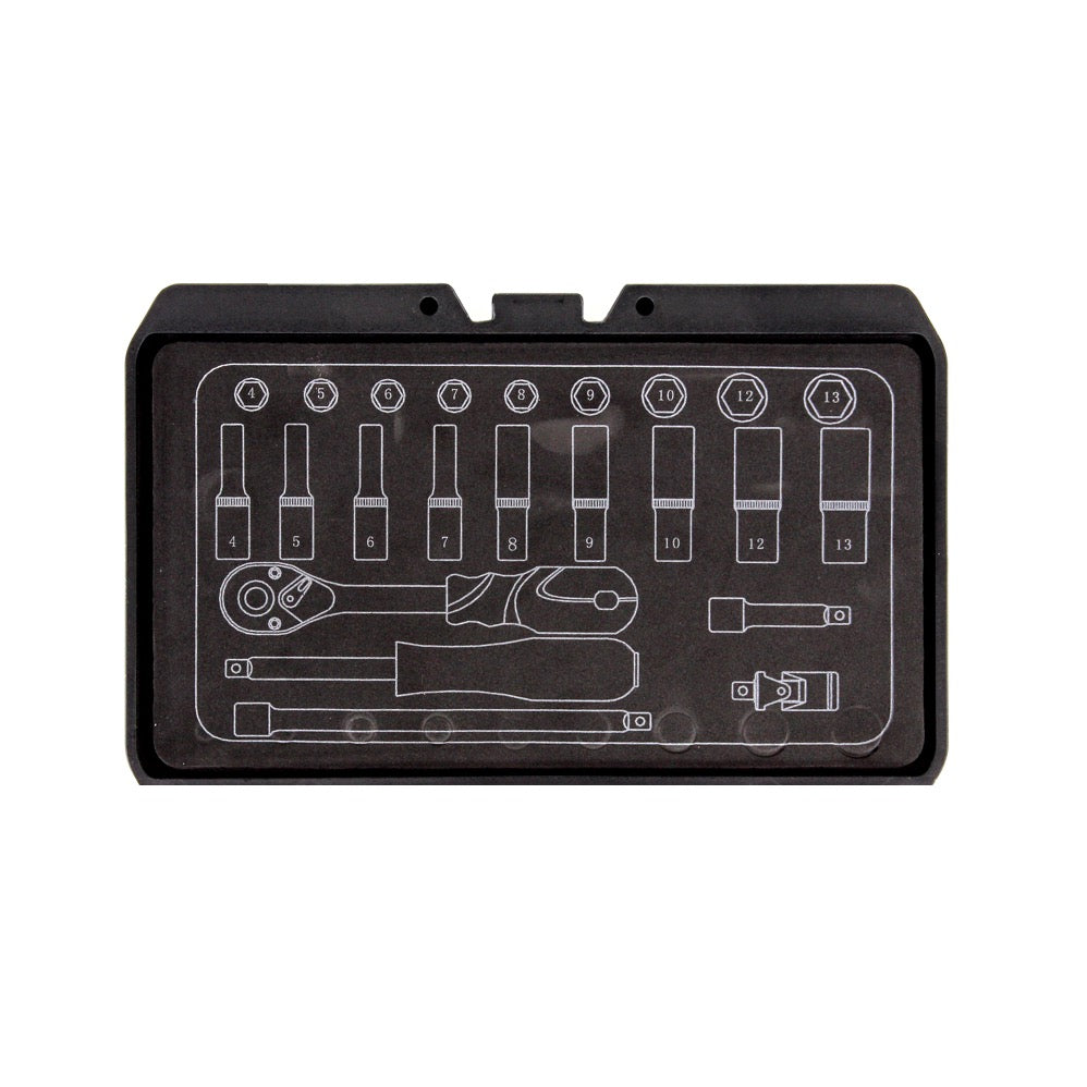 Ce set professionnel de clés à douille, du fabricant Yato dont les composants sont dotés de la douille 1/4', mettra à votre disposition la clé nécessaire dans n'importe quelle circonstance. Il contient un total de 23 douilles de 2 longueurs différentes en chrome vanadium, un cliquet 1/4', une douille de fixation 1/4', un manche 1/4' et deux rallonges, également avec douille 1/4'. Son boîtier solide en plastique offre un meilleur rangement.