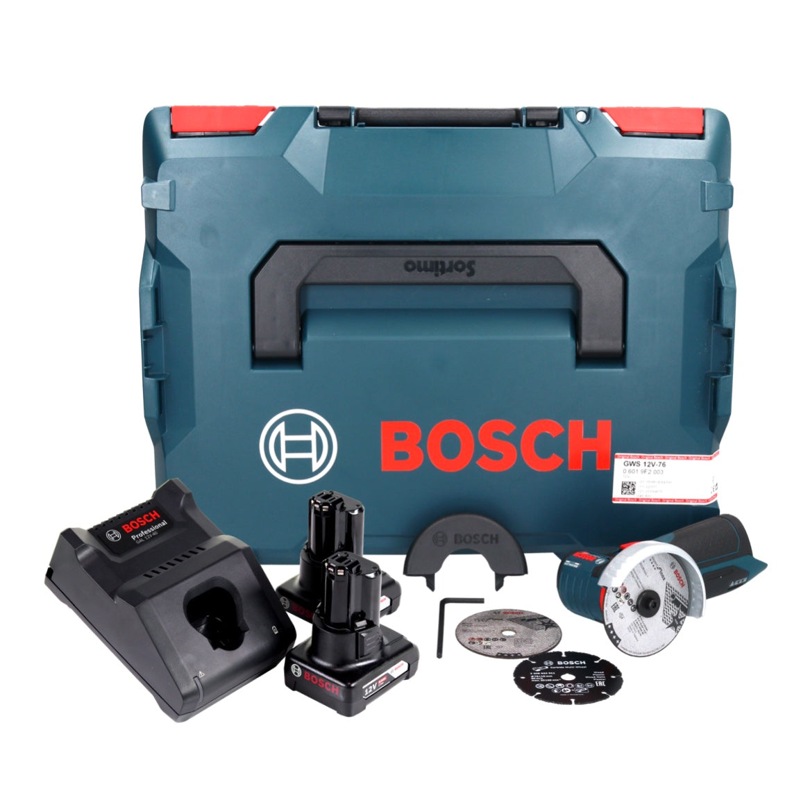 Bosch GWS 12V-76 Smerigliatrice angolare professionale a batteria 12 V 76 mm senza spazzole + 2x batteria ricaricabile 6,0 Ah + caricabatterie + L-Boxx