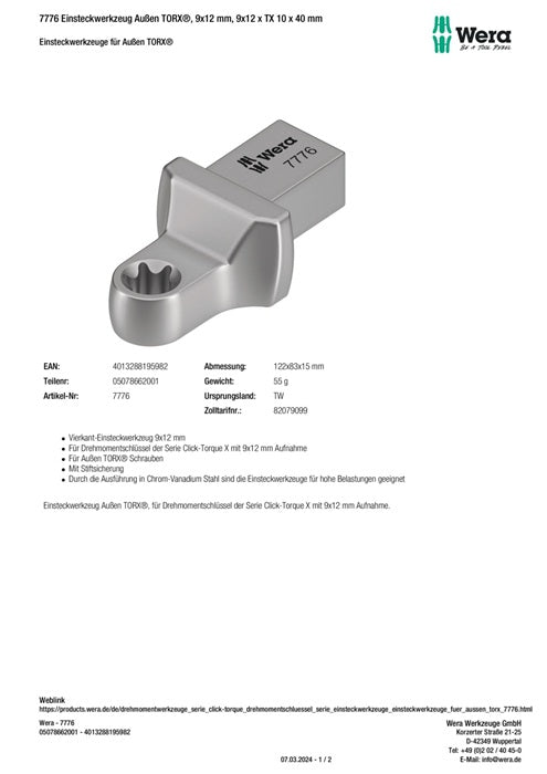 - 1x chiave a bussola WERA TX 10 9 x 12 mm