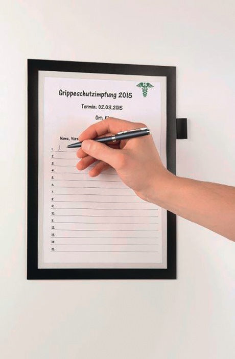 selbstklebend · Format DIN A4 · magnetische Vorderseite für schnelles und bequemes Wechseln von Informationen · direktes Beschriften des Dokumentes · Füllhöhe bis zu 5 Blatt 80g/qm · Stiftehalter für alle Stifte mit Befestigungsclip · haftet dauerhaft auf allen glatten Oberflächen