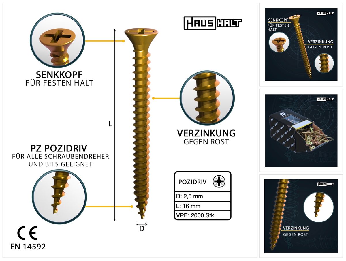 - 2000x HausHalt Universal Holzbauschraube Holzschraube 2,5 x 16 mm PZ1