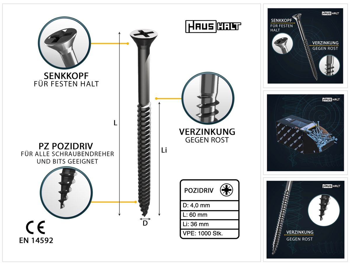 HausHalt Universal Holzbauschraube Holzschraube 4,0 x 60 mm PZ2 1000 Stk. ( 4x 000051371154 ) silber verzinkt Kreuzschlitz Pozidriv Senkkopf Teilgewinde
