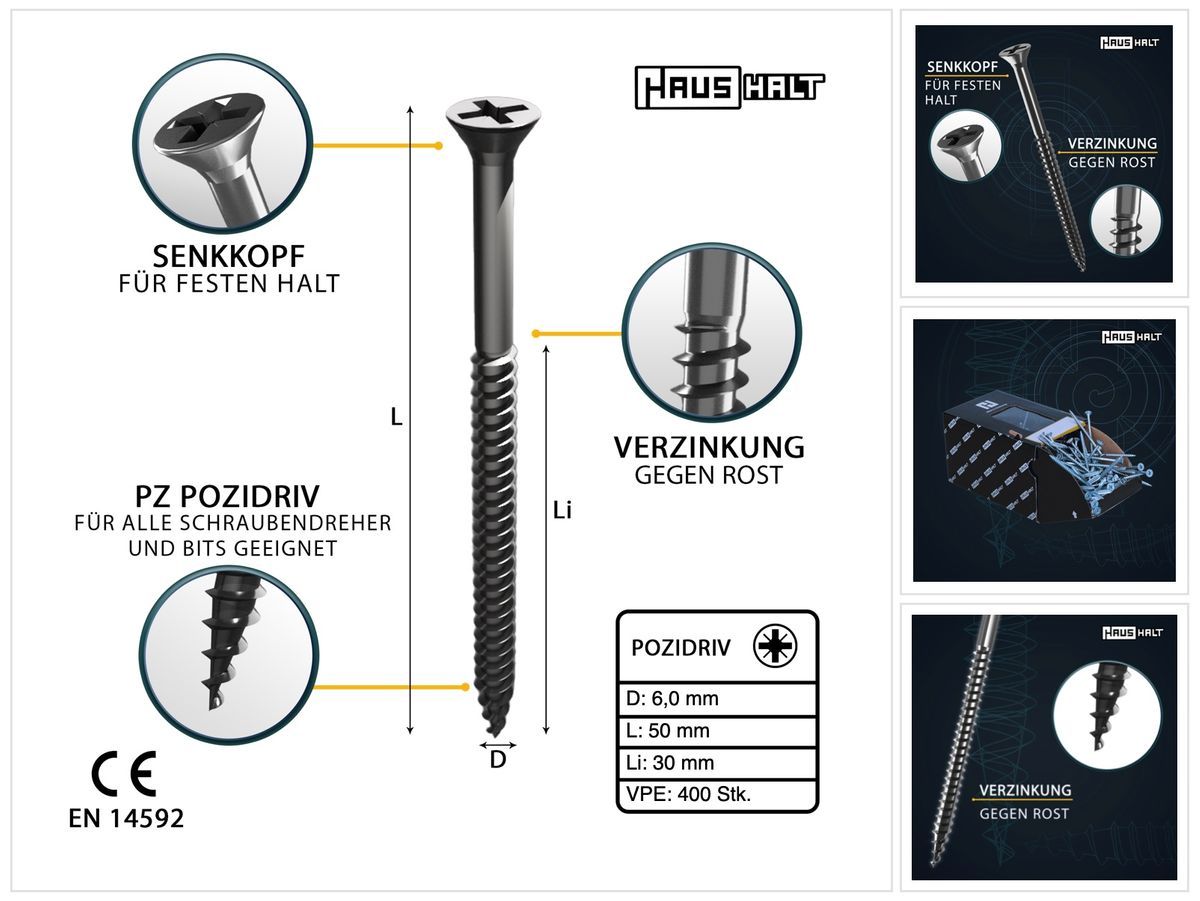 HausHalt Vite universale per legno 6,0x50mm - PZ3 - Zincata argentata - Cruciforme Pozidriv - Testa svasata - Filettatura parziale - 400 pz. (2x 000051371227)
