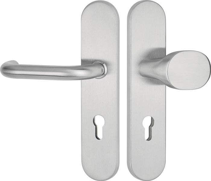 ZT-EN2 Wechselgarnitur mit Langschild 2089 S, Knopf 3128 gekröpft · Außenschild bestehend aus Stahl Unterkonstruktion mit gehärteter Außenplatte und Edelstahl Dekor-Abdeckschild, unsichtbar verschraubt · gehärtete Stahlnocken zur Aufnahme der Gewindeschrauben · 3-fach M6 Verschraubung mit Stahlschrauben und Gewindestopp · Knopf links / rechts verstellbar mit integrierter Verdrehsicherung · Innenschild mit Stahl-Unterkonstruktion und Edelstahl Dekor-Clipschild unsichtbar verschraubt · Drücker fest gelagert · Ausführung PZ gelocht · Aussenschild 12 mm stark