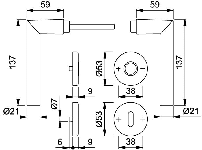 con attacco rapido a perno - quadro 8 mm - possibilità di utilizzare coppie di maniglie predisposte per spessori di porte di 37 - 42 mm - utilizzabile anche per rose con pacchetto di molle di ritorno - DIN sinistra/destra