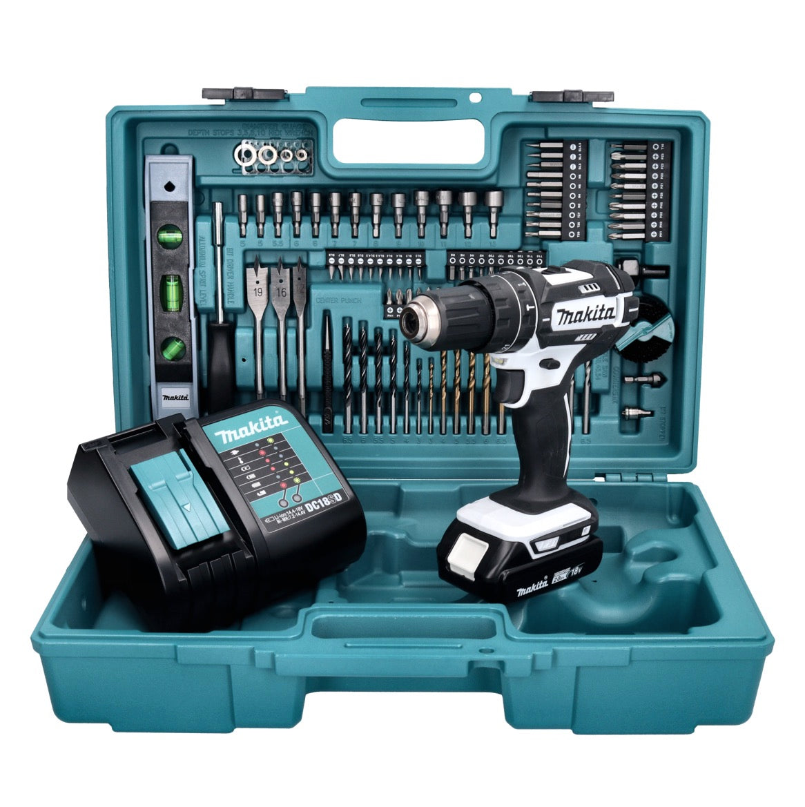 Makita DHP 482 SAX5W Akku Schlagbohrschrauber weiß 18 V 62 Nm + 1x Akku 2,0 Ah + Ladegerät + 101 tlg. Zubehör Set + Koffer