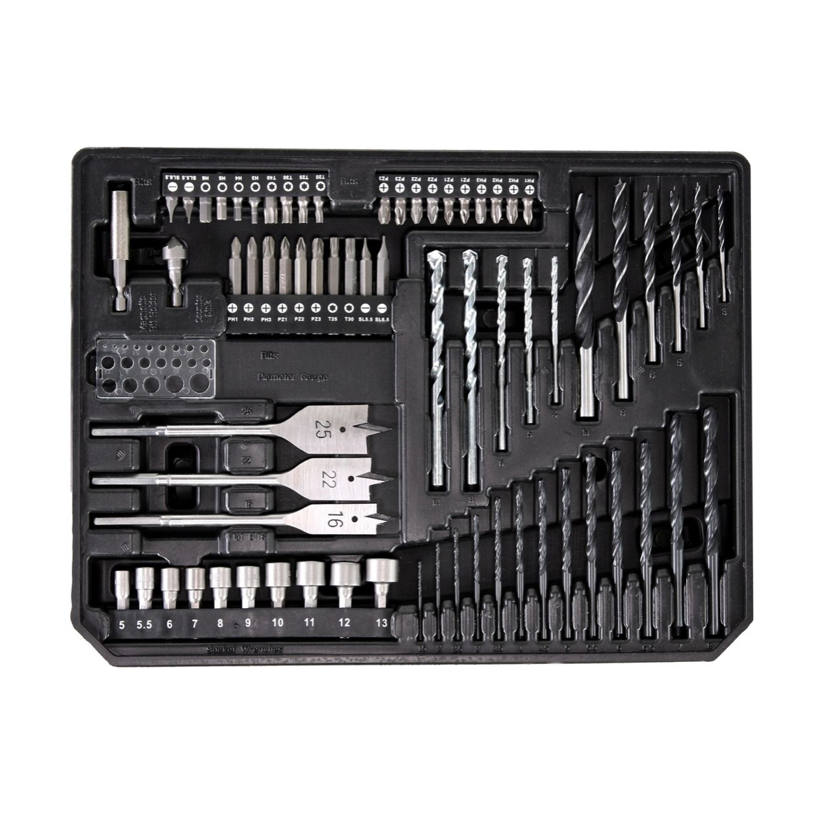 - 20x Bit 25 mm ( PH1 / PH2 / PZ1 / PZ2 / PZ3 / PZ3 / T20 / T2 / T30 / T40 / H3 / H4 / H5 / H6 / SL5,5 / SL6,5 )