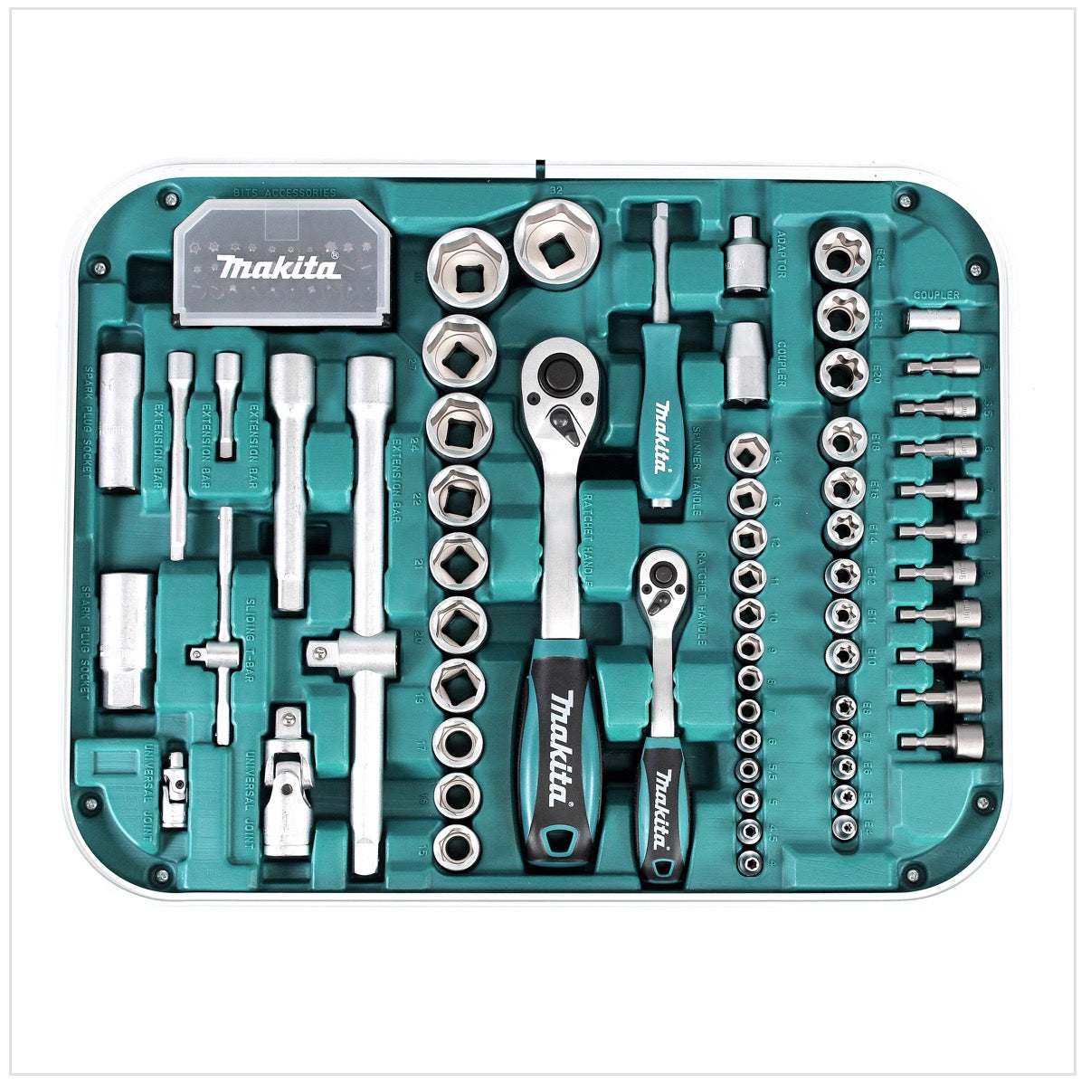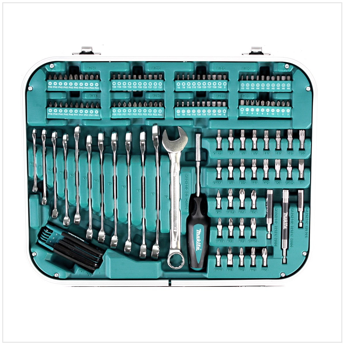 In questo set di utensili sono compresi vari cacciaviti, chiavi a bussola ed esagonali, ordinati e a portata di mano. I 227 pezzi sono prodotti nella comprovata qualità Makita per un uso lungo e impegnativo. Il set viene fornito in una robusta valigetta con serratura e rinforzo in alluminio.