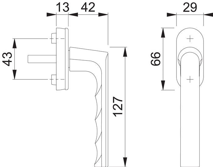 con VarioFit® - testato in conformità a DIN EN 13126-3: 23/180-0150/03/C1 e RAL-GZ 607/9 Rilevamento: 90° Struttura: PVC-U, camme di supporto Perno: perno pieno HOPPE, variabilità di lunghezza 10 mm, regolazione continua grazie alla molla di compressione integrata nel collo della maniglia Fissaggio: nascosto, viti filettate M5