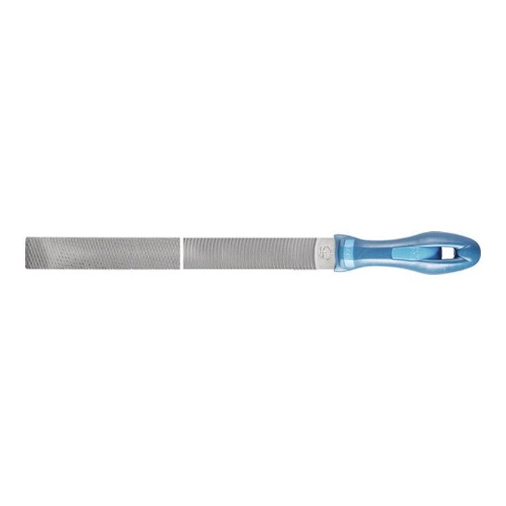 con impugnatura ergonomica - lima rettangolare con diversi denti fresati - parte anteriore a dentatura diagonale con rompitruciolo, parte posteriore a dentatura radiale, bordi non dentati - adatta per la sbavatura, la lavorazione dei bordi, la lavorazione delle superfici, la sgrossatura di un'ampia varietà di materiali, anche per stucchi di resina sintetica o legno con chiodi martellati, nonché per acciai fino a 1.200 N/mm² e acciaio fuso, o per la saldatura di giunture - nessun rotolamento della lima