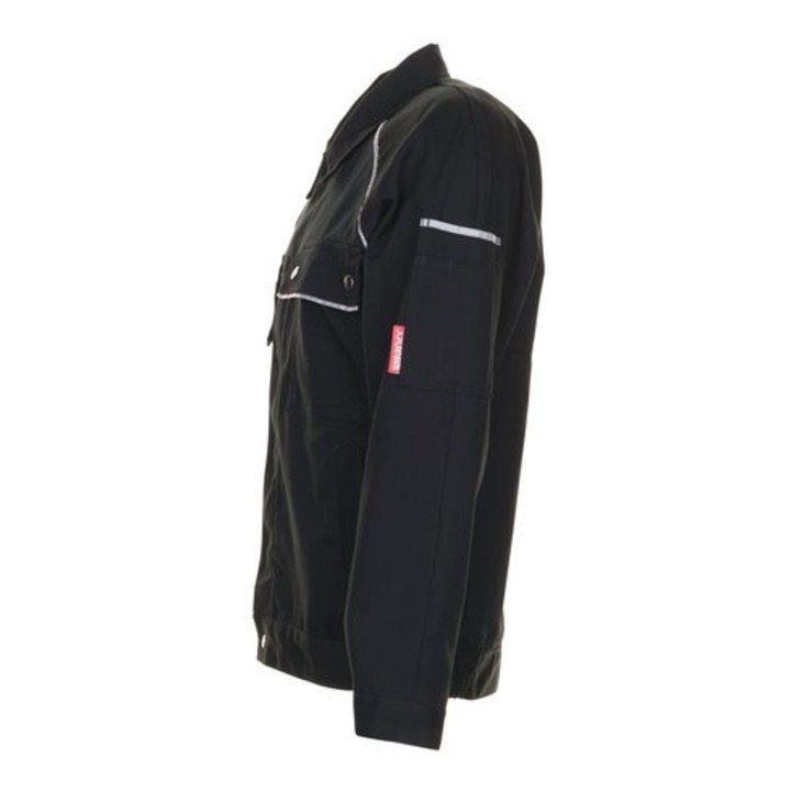 65% poliestere / 35% cotone - armatura a tela - ca. 320 g/m² - tessuto posteriore molto traspirante, particolarmente resistente, resistente al restringimento secondo DIN EN ISO 6330 - 2 tasche interne a marsupio in Cordura® - piping riflettente sull'inserto della manica e sulle patte delle tasche - 2 tasche sul petto, a sinistra con patta e bottoni a pressione, a destra con tasca aggiuntiva per il cellulare - tasca sulla manica a sinistra con doppio taschino per la penna - elastico in vita - abbottonatura con bottoni a pressione nascosti come chiusura anteriore - polsini delle maniche regolabili con bottoni a pressione disponibili su richiesta taglie: 42-64, 90-110 e 24-27