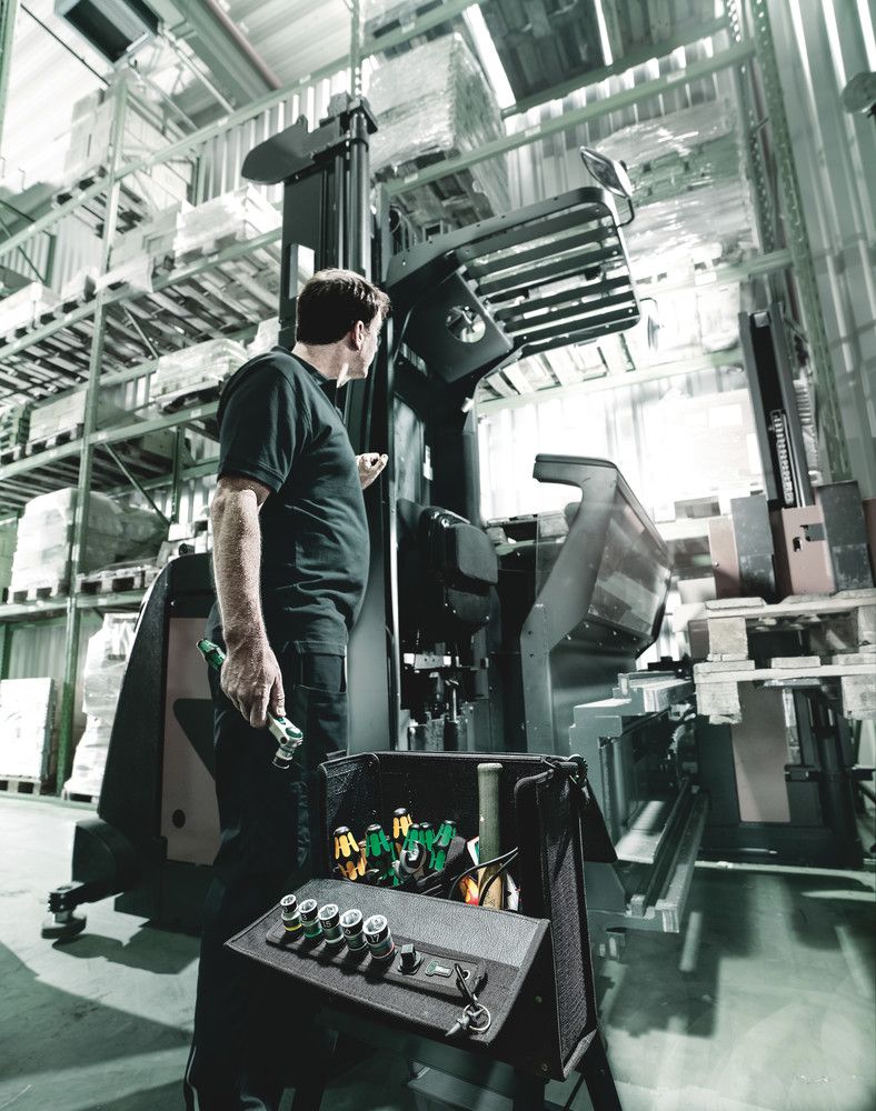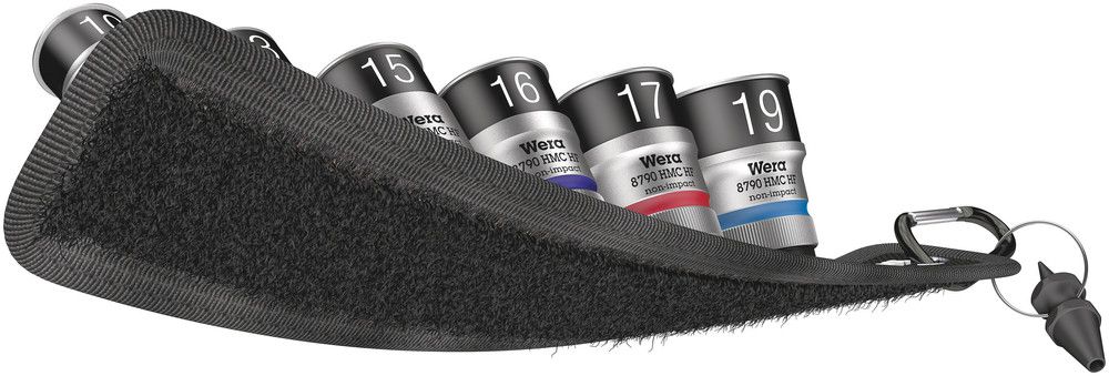 Attacco quadro da 12,5 mm (1/2″) - con supporto in pile e strisce di velcro per un facile fissaggio, ad esempio a scaffali, carrelli da officina e al sistema di trasporto utensili Wera 2go - meccanismo rotante scorrevole per una conservazione sicura e una facile rimozione