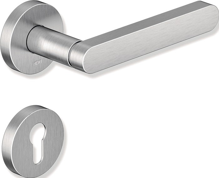 in tecnologia H con rose a norma DIN 18255 e DIN EN 1906 in acciaio inox, finitura satinata, composto da: Maniglia a leva modello 271X... a L in acciaio inox (1.4301), diametro dell'aletta 21,3 mm, con guida dell'aletta e scanalatura di bloccaggio, con vite di fissaggio M5 come fissaggio supplementare della maniglia a leva con il mandrino quadrato per una trasmissione ottimale della forza nell'anta della porta. L'installazione avviene semplicemente inserendo la maniglia a leva nelle parti inferiori premontate sulla porta. Il meccanismo di chiusura può essere sbloccato nuovamente con una chiave di smontaggio. Rosette 305.21X... e 306.23X..., sottostruttura 305.21X... in materiale composito plastica/acciaio con superficie nera in zinco/nichel per una protezione ottimale dalla corrosione, modulo di fermo integrato con supporto a molla, utilizzabile DIN sinistro e DIN destro, per sostenere la serratura per una maggiore durata. Cuscinetto fisso della maniglia a leva con bloccaggio automatico a tutto campo e punto di appoggio da 5 mm come cuscinetto a strisciamento esente da manutenzione con area di compensazione elastica per eliminare eventuali imprecisioni di installazione. Vite nascosta, a prova di allentamento, con combinazione di vite e bussola M5 in acciaio inox e tasselli di supporto incassati nell'anta della porta. Coperchio a rosetta, rotondo, in acciaio inox (1.4301), diametro 55 mm, altezza 10,5 mm, spessore parete 1,5 mm. Progettato e testato per il settore contract, categoria d'uso secondo DIN EN 1906 - rubinetteria di classe 4, con perno quadro 8 mm, per porte di spessore 38-48 mm - lunghezza della maniglia 150 mm - Zimmergarnitur