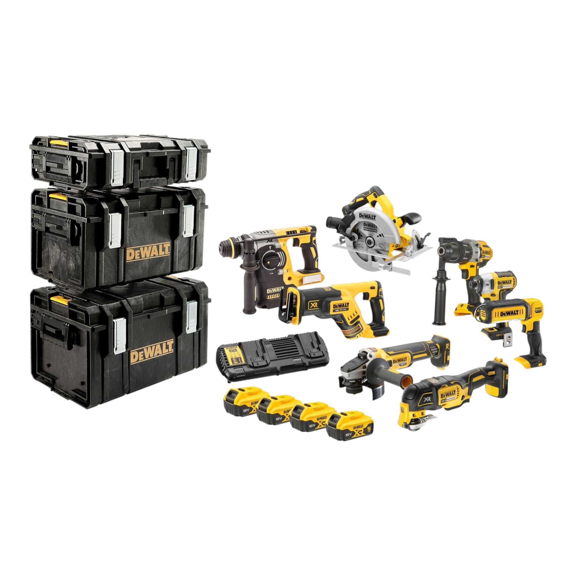 Set di utensili a batteria DeWalt DCK 853 P4T 18 V DCD 996 + DCF 887 + DCH 273 + DCG 405 + DCS 367 + DCS 356 + DCS 565 + DCL 050 + 4 batterie 5,0 Ah + caricabatterie + 4x T STAK + carrello