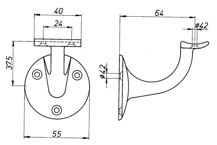 supporto curvo - distanza dalla parete 64 mm - piastra a parete 53 Ø - con fori per viti svasate