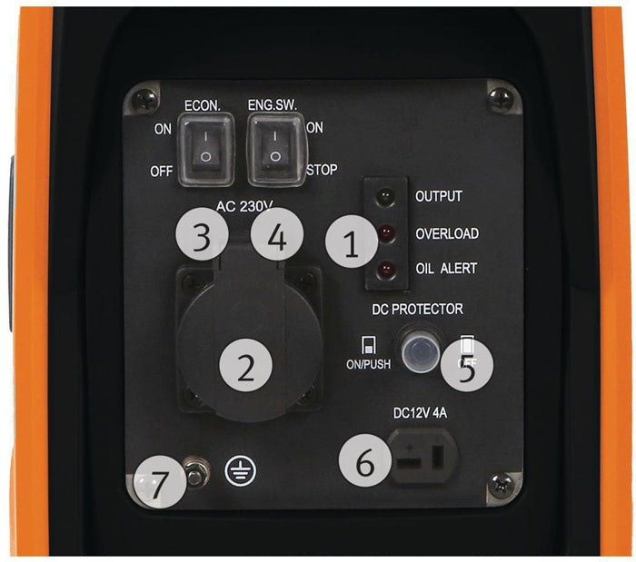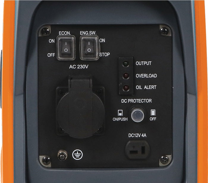 Invertertechnik für konstante Leistung · für Heim und Garten, Camping, Wohnwagen, Boote, Computer und andere empfindliche elektronische Geräte · Eco Modus regelt die Drehzahl je nach Stromverbrauch · Choke für problemlosen Kaltstart · Kontrollleuchten für Ausgangsspannung, Überlastung und Ölmangel · Überlastschutz durch Thermoschutzschalter · Ölmangelabschaltung mit Warnlampe Lieferung ohne Motoröl (15 W 40)