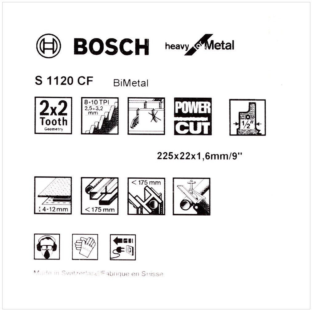 Die Bosch Säbelsägeblätter Heavy for Metal S 1120 CF haben die von Bosch patentierte 2x2 Tooth Geometry. Die S 1120 CF eignen sich zum Sägen von dicken Blechen bis 12mm und massive Rohre und Metall-Profile bis 175 mm. Der Schnitt der Bosch Heavy for Metal ist ein kraftvoller und grober.