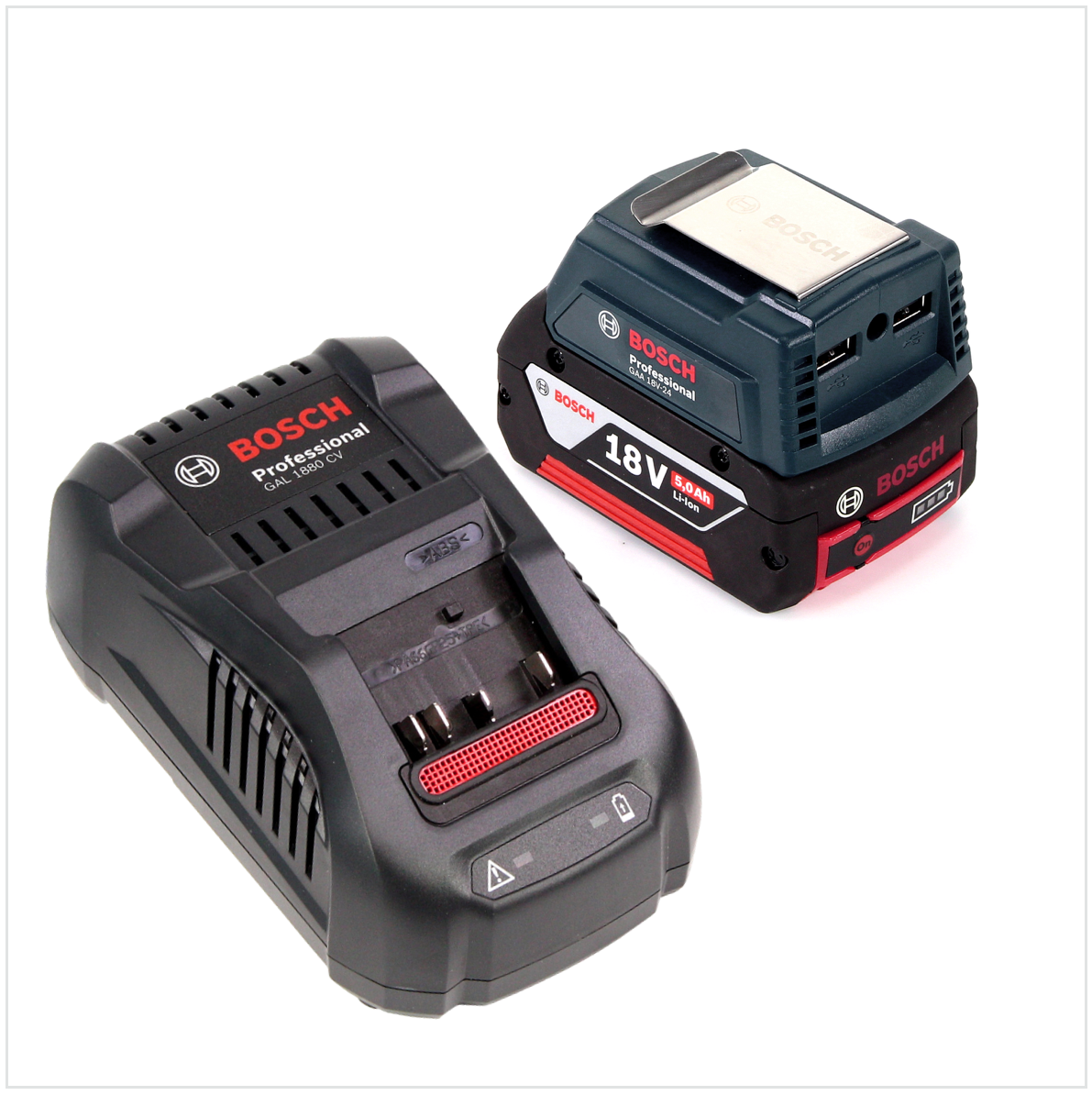 Bosch USB Power Set 18 V mit GAA Professional USB Adapter für 14,4 V / 18 V Akkus + 1x GBA 18V 5,0 Ah Li-Ion Einschub Akku + 1x Schnell Ladegerät GAL 1880 CV
