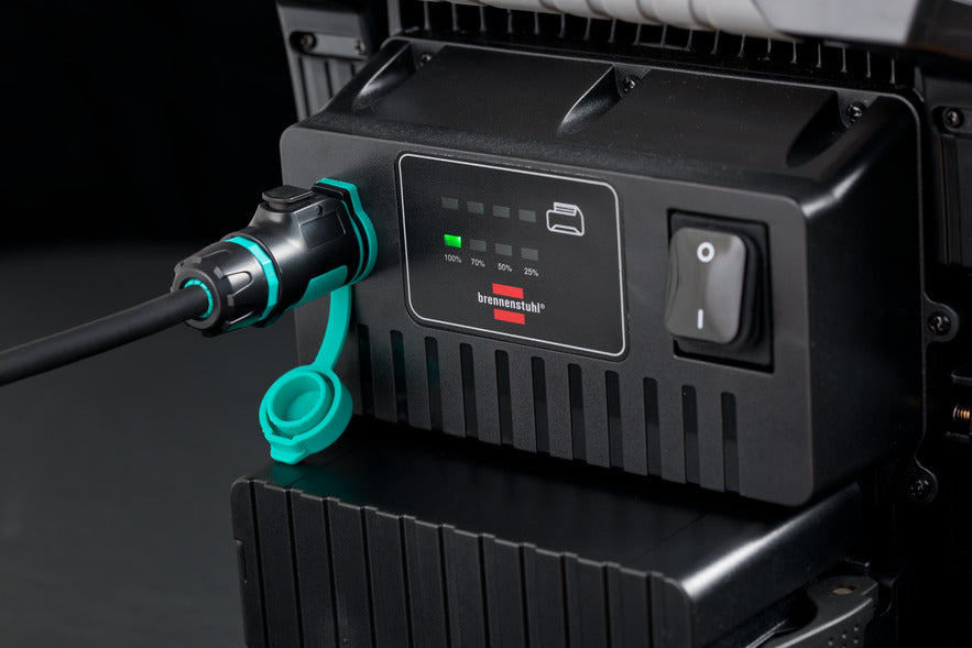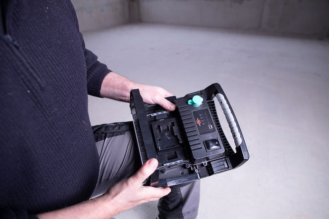 - Hybrydowy reflektor LED z wieloma akumulatorami 6050 MH, 4 adaptery Bosch, Makita, Metabo, Milwaukee/Dewalt, torba, odłączany kabel 5 m H07RN-F2X1.0
