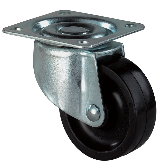 Obudowa z blachy stalowej, ocynkowana i chromianowana - jednorzędowy zespół kuli i koszyka w głowicy widelca - nitowana oś koła - łożysko ślizgowe - z mocowaniem płytowym - koło z tworzywa sztucznego (czarne)