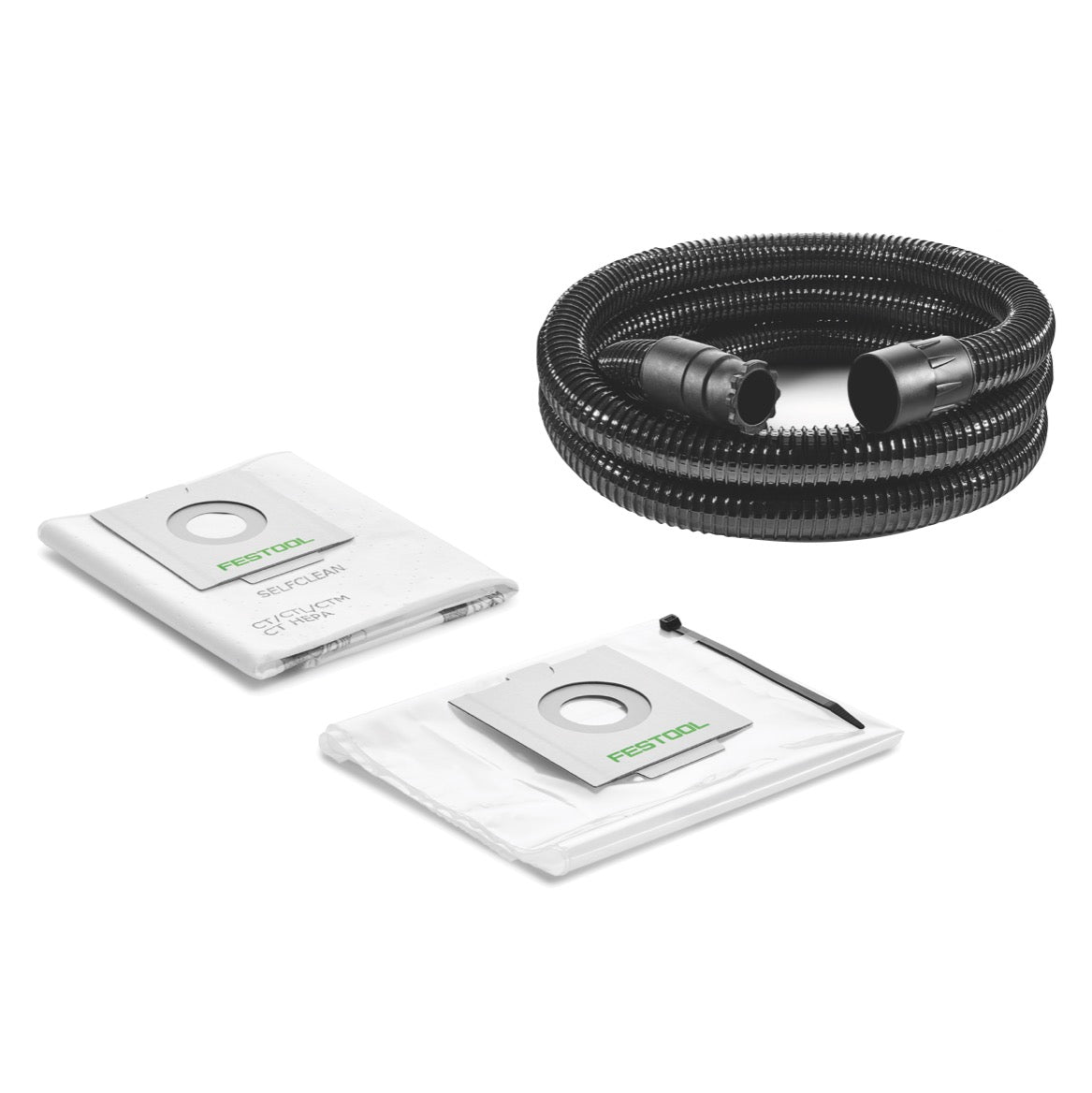 - 1x odkurzacz mobilny Festool CTM 36 E CLEANTEC - 1x worek na odpady - 1x wysokowydajny filtr główny - 1x zwijacz przewodu - 1x odporny na załamania wąż ssący D36x3,5-AS/LHS 225 - 1x magazyn węża - 1x worek filtrujący SELFCLEAN - 1x stacja dokująca SYS-Dock z funkcją T-LOC - 1x zasuwa zamykająca ComfortClean