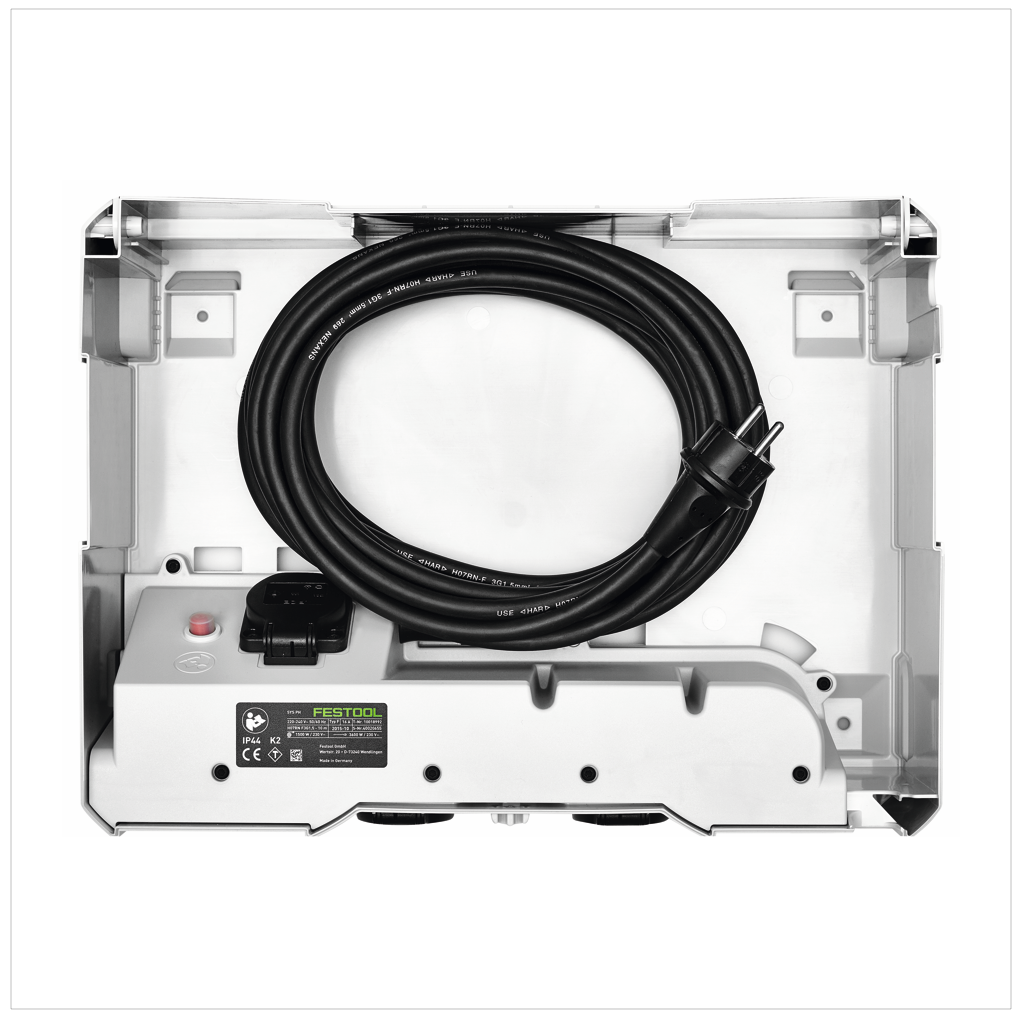 Bęben kablowy Festool w praktycznej konstrukcji Systainer zawiera zamontowany na stałe kabel przyłączeniowy o długości 10 metrów, który można schować wewnątrz Systainera podczas transportu. Oprócz tego miejsca do przechowywania, SYS-Powerhub oferuje również miejsce na akumulatory lub małe części. Zwijacz kabla jest wyposażony w cztery gniazda zewnętrzne i jedno gniazdo wewnętrzne do ładowania wrażliwych narzędzi lub telefonów komórkowych. Czerwona dioda LED z przodu wskazuje, że bęben kablowy jest podłączony do sieci, a zintegrowane termiczne zabezpieczenie przed przeciążeniem zapewnia bezpieczeństwo i wydłuża żywotność SYS-Powerhub. Dzięki dwóm wyjściom kablowym bęben kablowy jest w pełni funkcjonalny nawet po zamknięciu i podłączeniu.