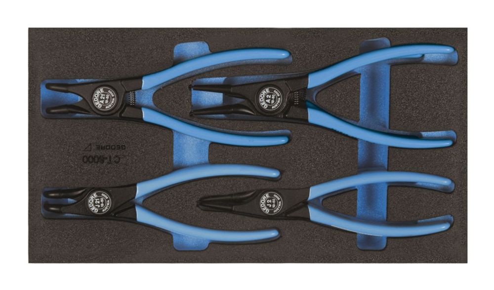 (moduł 1/3) ze szczypcami do pierścieni osadczych (zewnętrznych i wewnętrznych) - ze szczękami prostymi i kątowymi - ze specjalnej stali chromowo-wanadowej, hartowanej i odpuszczanej Zawartość: szczypce do pierścieni osadczych zewnętrznych (czarne, z niebieską osłoną rękojeści, zabezpieczenie przed przytrzaśnięciem): 1 szt. ze szczękami prostymi, kształt A do pierścieni osadczych 10 - 25 mm, długość 141 mm 1 szt. ze szczękami prostymi, kształt A do pierścieni osadczych 19 - 60 mm, długość 182 mm 1 szt. ze szczękami skośnymi, kształt B do pierścieni osadczych 19 - 60 mm, długość 170 mm Zawartość dla pierścieni osadczych wewnętrznych (czarne, z niebieskim zabezpieczeniem uchwytu przed zanurzeniem, zabezpieczenie przed przytrzaśnięciem): 1 sztuka z prostymi szczękami, kształt C do pierścieni osadczych 12 - 25 mm, długość 141 mm 1 sztuka z prostymi szczękami, kształt A do pierścieni osadczych 19 - 60 mm, długość 183 mm 1 sztuka z kątowymi szczękami, kształt D do pierścieni osadczych 19 - 60 mm, długość 169 mm