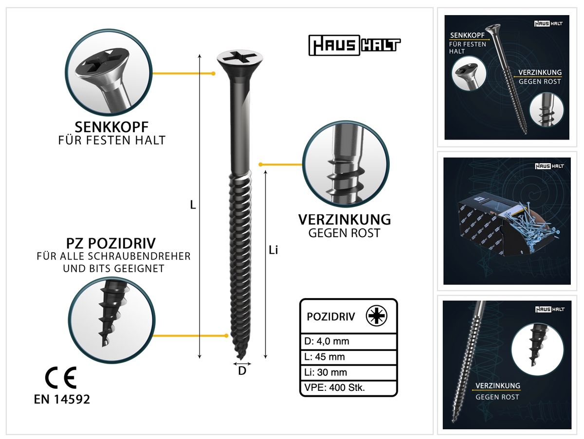Wkręt do drewna HausHalt z wgłębieniem Pozidriv gwarantuje użytkownikowi wysoki stopień elastyczności dzięki uniwersalnemu zastosowaniu w drewnie. Łeb stożkowy zapewnia czyste i równe pogłębienie wkrętu w drewnie. Wgłębienie Pozidriv gwarantuje bezpieczne i szybkie wkręcanie w ciągu kilku sekund. Czysty gwint wkrętu zapewnia łatwe i bezpieczne wkręcanie. Galwanizacja zapewnia ochronę przed korozją i znacznie wyższą twardość powierzchni niż konwencjonalne gołe wkręty, co oznacza, że zakres zastosowań można wielokrotnie rozszerzyć w obszarach zewnętrznych.