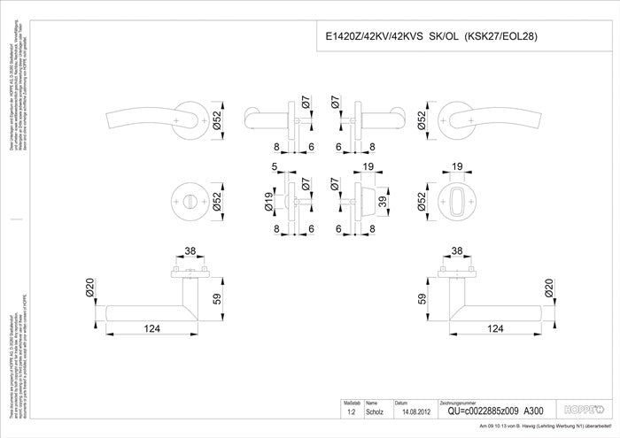Zestaw rozet z kluczami - testowany zgodnie z DIN EN 1906: 37-0140A (kategoria użytkowania 3), okucie kontraktowe - łożyskowanie: klamki luźne, sprężyny powrotne mogą być używane z prawej / lewej strony, bezobsługowe łożyska ślizgowe - z szybkozłączem dla D/D z pełnym trzpieniem HOPPE (część otworowa / otworowa), dla K/D z pełnym trzpieniem HOPPE FDW (część otworowa) - podkonstrukcja: Tworzywo sztuczne, krzywki podporowe - Mocowanie: ukryte, ciągłe, naprzemienne, śruby uniwersalne UWAGA: należy zwrócić uwagę na DIN prawy lub lewy dla okuć wymiennych!