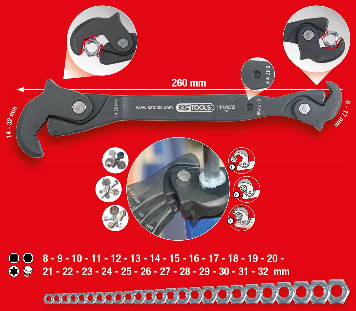 KS TOOLS Einhand-Multifunktions-Schlüssel, 8-17/14-32mm ( 114.0055 )