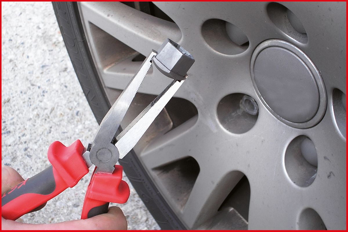 • speziell geformte Zangenspitze zum optimalen Abziehen der Radschrauben-Schutzkappen