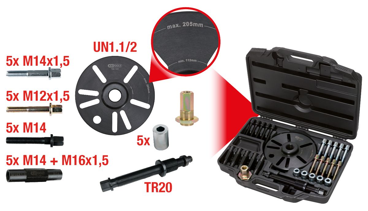 Produktbeschreibung:Universal-Radnabenabzieher für PKW, SUV, + Transporter, 28-tlg ·