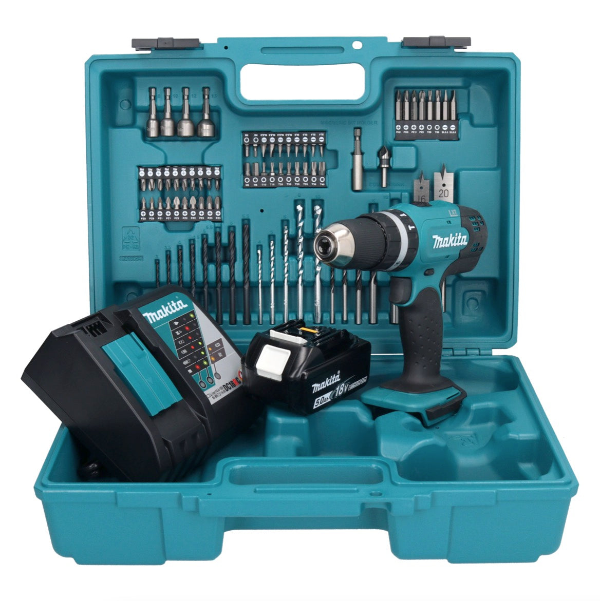 Makita DHP 453 RT1X1 Akku Schlagbohrschrauber 18 V 42 Nm + 1x Akku 5,0 Ah + Ladegerät + 74 tlg. Zubehörset + Koffer