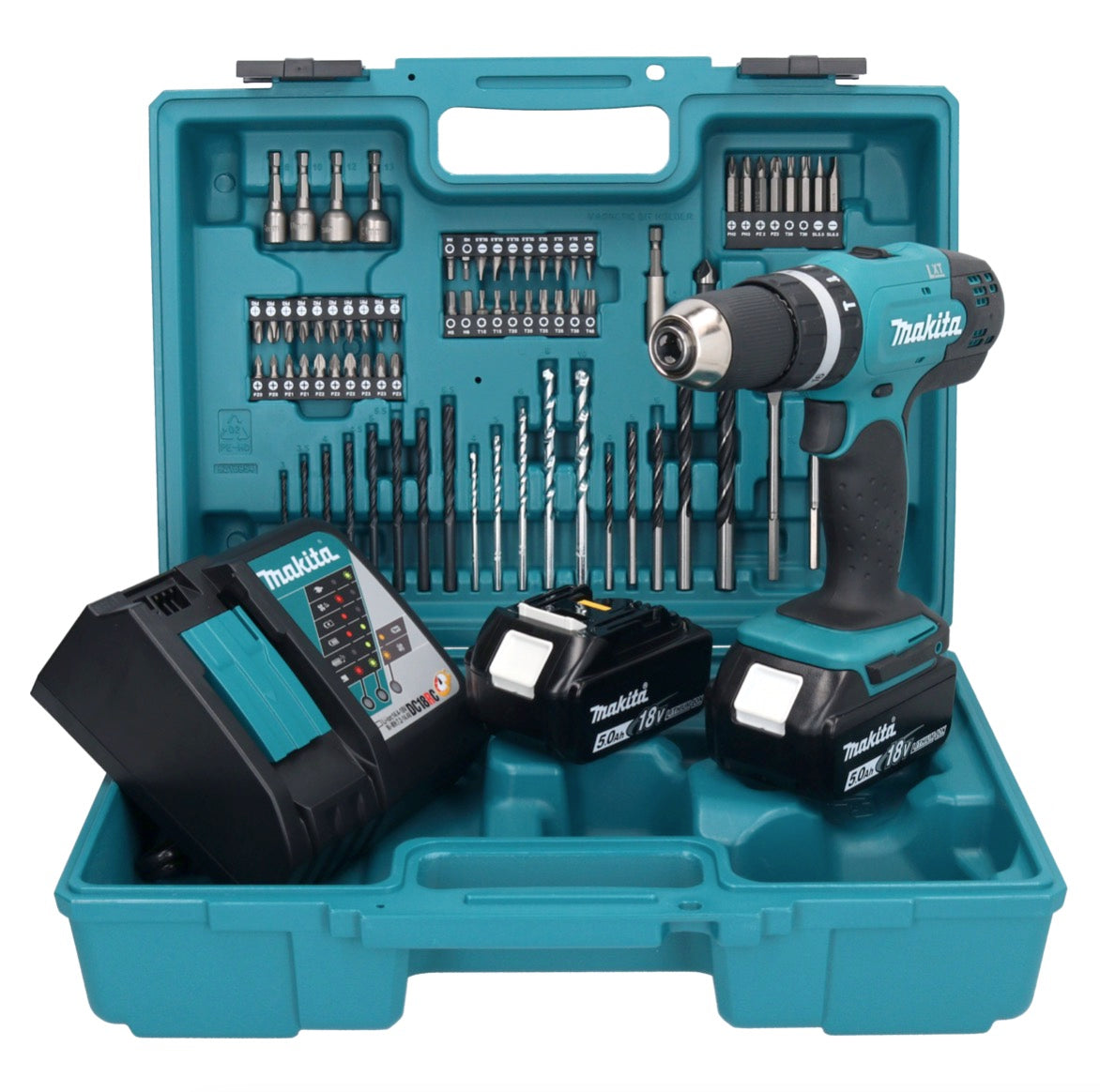 Makita DHP 453 RTX1 Akku Schlagbohrschrauber 18 V 42 Nm + 2x Akku 5,0 Ah + Ladegerät + 74 tlg. Zubehörset + Koffer