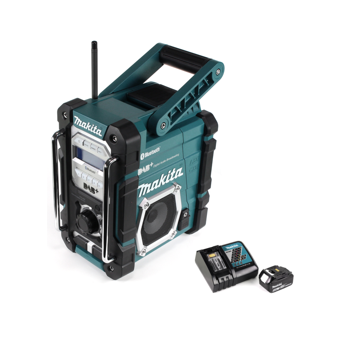 Radio budowlane Makita DMR 112 Bluetooth nadaje się do odbioru DAB, DAB+ i FM. Jest wyposażone w port USB i Aux do ładowania telefonu komórkowego lub tabletu i odtwarzania muzyki. Radio może być zasilane wszystkimi akumulatorami litowo-jonowymi Makita od 7,2 do 18 V, ale nie akumulatorami Maktec lub serii G. Do stałego zasilania radiotelefonu dostarczany jest zasilacz sieciowy. Nie nadaje się on jednak do ładowania akumulatorów. Stacje można precyzyjnie ustawić za pomocą dużego wyświetlacza cyfrowego. Obudowa jest bryzgoszczelna w stopniu ochrony IP64. Radio jest zatem idealnym towarzyszem na placu budowy, nawet w złych warunkach pogodowych.