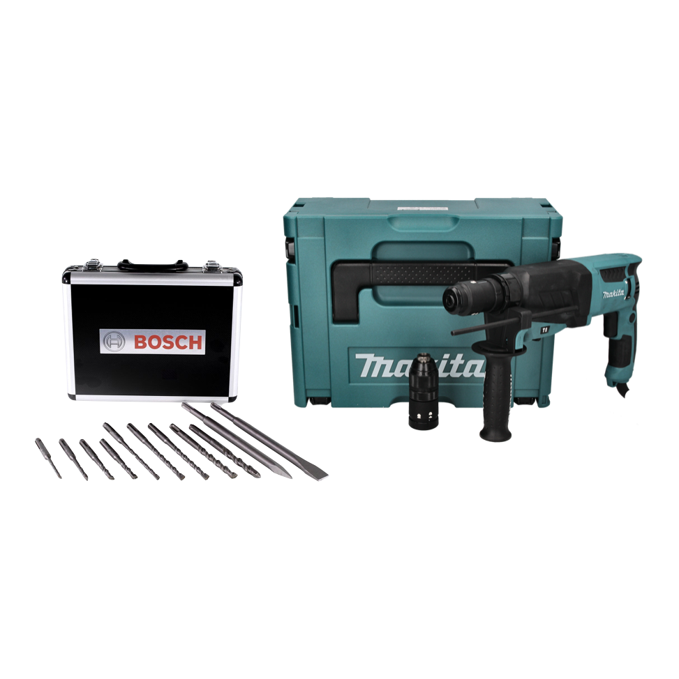 Makita HR 2630 TJ Kombihammer 800 W 2,4 J SDS Plus + 11 tlg. Bohrer Meißel Set + Schnellspannfutter + Makpac