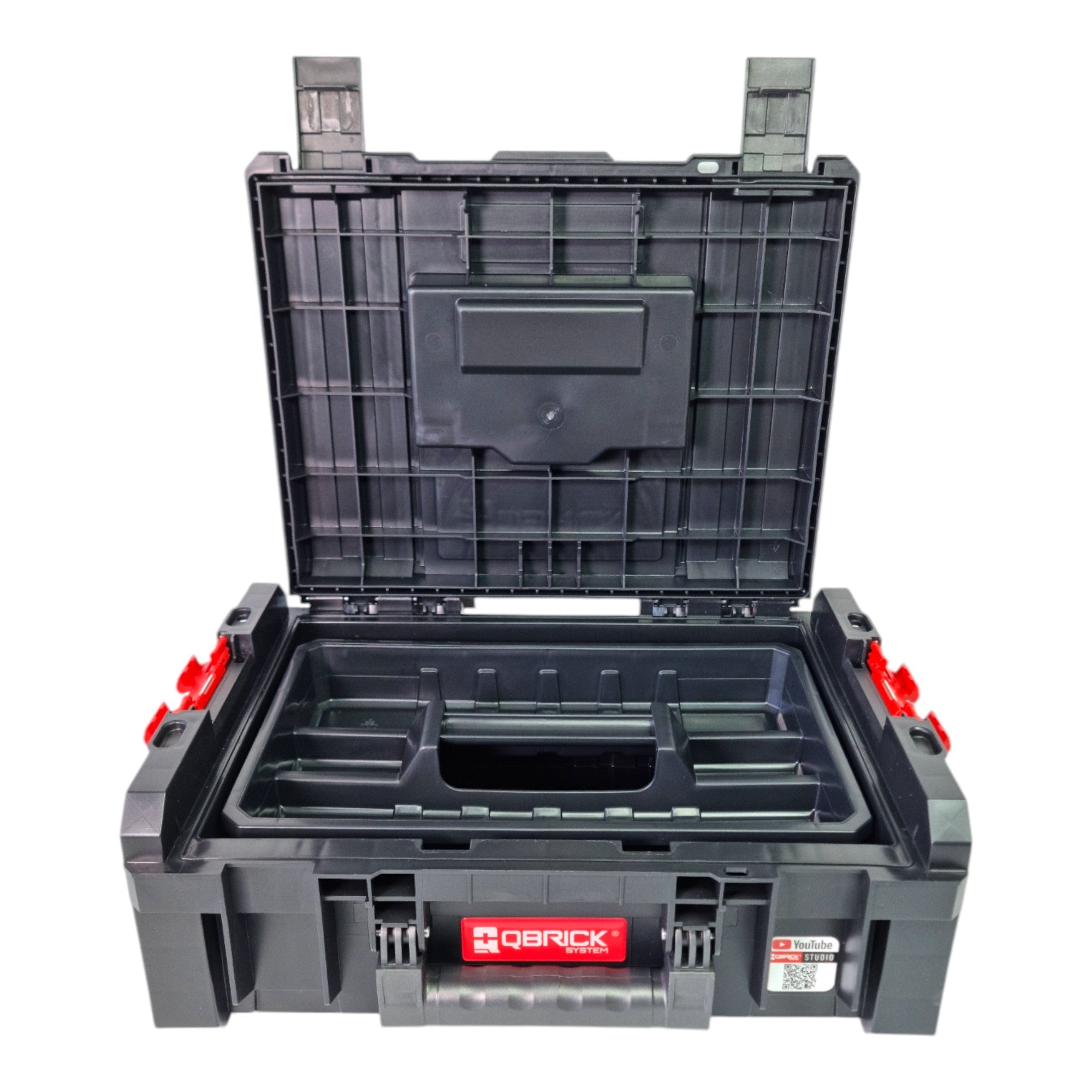 Qbrick System PRO Technician Case - to średniej wielkości walizka modułowa z linii PRO, która jest już standardowo wyposażona w przestronną półkę i elastyczną uszczelkę zintegrowaną z pokrywą, co zapewnia jej wysoką odporność na wnikanie pyłu i wody. Rozmiar i modułowa konstrukcja walizki dla techników sprawiają, że jest to idealna walizka do przechowywania i transportu szerokiej gamy elektronarzędzi.