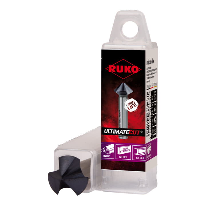 Całkowicie nowa geometria krawędzi skrawającej ULTIMATECUT firmy RUKO znacznie zmniejsza siły osiowe i promieniowe działające na narzędzie podczas procesu pogłębiania. Specjalnie opracowane, zmienne podcięcie zapewnia bardzo płynny proces pogłębiania. Daje to precyzyjną, okrągłą i pozbawioną odprysków powierzchnię pogłębiania, a tym samym gwarantuje najlepsze wyniki. Specjalnie opracowane parametry przestrzeni wiórowej, takie jak kąt natarcia, promień przejścia i bardzo szeroki rowek wiórowy, zapewniają optymalne odprowadzanie wiórów i ciepła, a tym samym zapewniają bardzo wysoką odporność na zużycie. Ponadto nowa geometria przeciwdziała zgrzewaniu materiału i znacznie zmniejsza siły pogłębiania. Podczas procesu pogłębiania wymagana jest teraz znacznie mniejsza siła posuwu. Materiały mogą być obrabiane z bardzo wysokimi lub niskimi prędkościami skrawania bez utraty jakości pogłębiania. ULTIMATECUT osiąga najlepszą wydajność w niemal wszystkich materiałach i zastosowaniach.