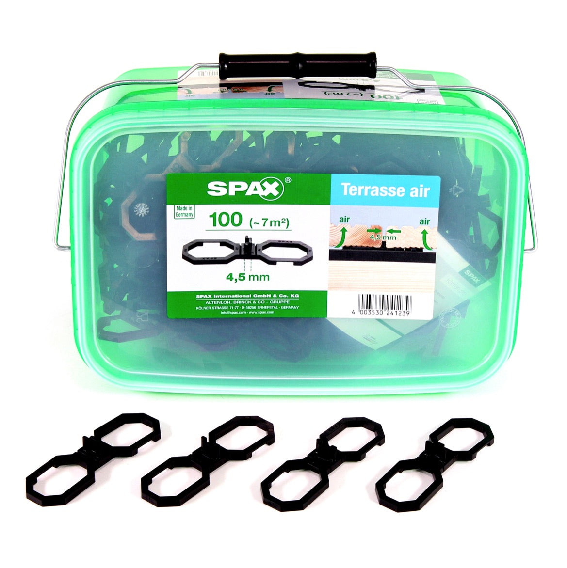 - 1x SPAX Henkelbox mit 100 Terasse Air Abstandshaltern 4,5 mm für Holzdielen Terasse ( 5009422545009 )