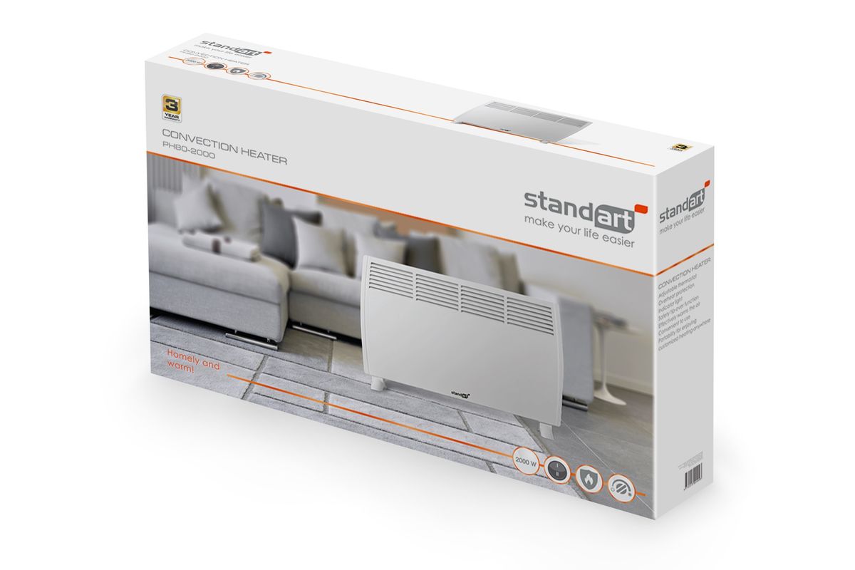 STANDART PH80-2000 to biały, sterowany mechanicznie grzejnik konwekcyjny o mocy 2,0 kW (2000 W). Grzejnik nadaje się do ogrzewania pomieszczeń o łącznej powierzchni nie większej niż 20 m². Na górze grzejnika znajdują się dwa przełączniki, które regulują działanie grzejnika. Poniżej przełączników znajduje się lampka, która zapala się, gdy grzejnik jest włączony. Urządzenie może pracować na dwóch poziomach grzania (wysokim i niskim). Do zalet należy zaliczyć ochronę przed przegrzaniem oraz stosunkowo niską wagę, która nie ogranicza mobilności grzejnika.