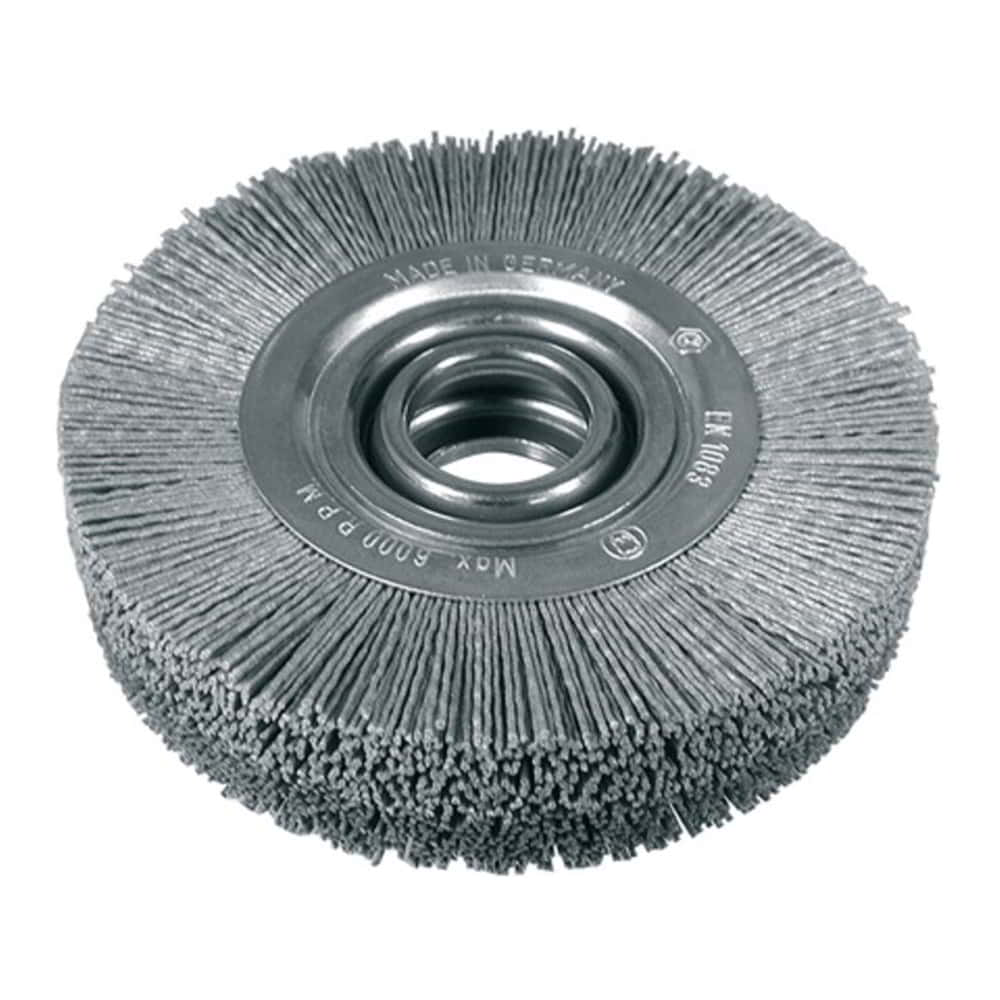 Okrągła nylonowa szczotka ścierna z węglikiem krzemu do obróbki wykańczającej - do stosowania na maszynach polerskich i maszynach CNC - otwór Ø 31,75 mm - Zalety: równomierny efekt ścierny, ponieważ nowy materiał ścierny jest stale uwalniany w miarę zużywania się materiału nośnego wysoka sprężystość i elastyczność bez ryzyka pęknięcia brak zapychania powierzchni żarnika pozostałościami pracy nadaje się do pracy na mokro i na sucho, ponieważ nylon nie wchłania znacznych ilości chłodziwa ani smaru odporny na słabe kwasy i zasady brak konieczności ponownego przycinania żarnika przy normalnym użytkowaniu długa żywotność w optymalnych warunkach odpowiednia prędkość (22 m/s) niski nacisk kontaktowy niskie wytwarzanie ciepła Obszary zastosowań: Usuwanie lekkiej rdzy z karoserii samochodowych Gratowanie i dokładne szlifowanie laminatów, płytek drukowanych i obwodów drukowanych Gratowanie zadziorów po cięciu i wykrawaniu Plastikowanie, szorstkowanie i matowanie Szlifowanie drewna i sklejki.