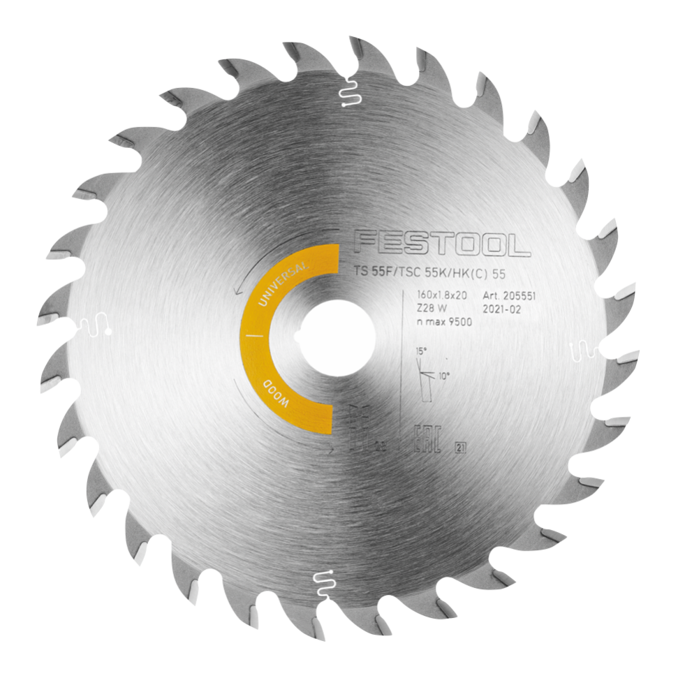 Tarcza pilarska Festool Wood Universal HW jest kompatybilna z zagłębiarkami TS 55 F, TSC 55 K oraz ręcznymi pilarkami tarczowymi HKC 55, HK55. Wysokiej jakości obróbka materiału wykonanego z wysokogatunkowej stali i zębów piły wykonanych z bardzo drobnoziarnistego węglika spiekanego zapewnia doskonałe cięcie, a tarcza wytrzymuje najtrudniejsze warunki, zapewniając jednocześnie wysoką precyzję. Kształty zębów i kąty cięcia brzeszczotów są zoptymalizowane pod kątem maszyny, zapewniając wysoką jakość cięcia przy niskim zużyciu i długiej żywotności. Brzeszczot jest uniwersalny do cięcia wszystkich materiałów drewnopochodnych, takich jak lite drewno, płyty stolarskie, sklejka, płyty multiplex/sklejka, płyty wiórowe, płyty MDF i HDF. Oznaczenie kolorystyczne brzeszczotów ułatwia określenie przydatności do danego materiału.