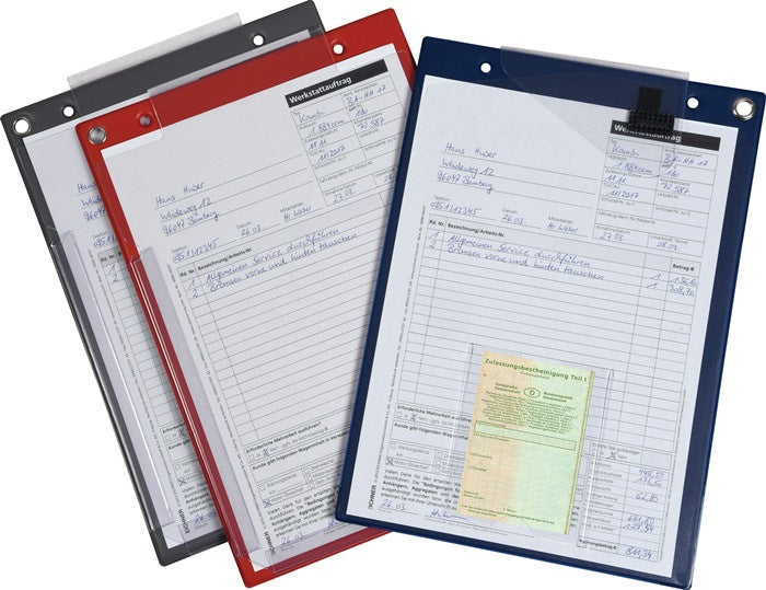 DIN A4 - solidna konstrukcja z przezroczystą kieszenią i przegrodą na prawo jazdy z przodu - z zapięciem na rzep i sznurkiem - z tyłu z bardzo dużą zakładką do przechowywania książeczek serwisowych, dzienników itp. PU = 10 szt.