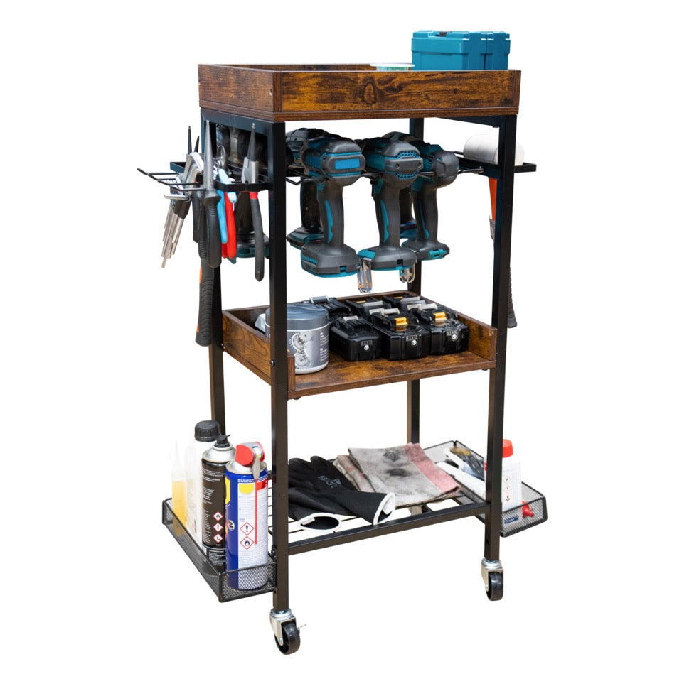 Wózek warsztatowy Toolbrothers przyciąga wzrok w każdym warsztacie, piwnicy lub garażu. Narzędzia są szybko i łatwo uporządkowane i gotowe do użycia. Można w nim łatwo przechowywać do siedmiu wkrętarek akumulatorowych. Jest też wystarczająco dużo miejsca na ładowarki lub akumulatory. Na niższym poziomie można przechowywać na przykład walizki lub organizery. Oczywiście są też półki. Oznacza to, że z każdego narzędzia można korzystać szybko i łatwo. Ponadto wózek warsztatowy ma również możliwość przymocowania wkrętaków i innych narzędzi ręcznych z boku. Górna półka może być używana uniwersalnie dzięki bocznym ściankom, dzięki czemu można szybko i sprawnie korzystać z dowolnych narzędzi lub pomocy.