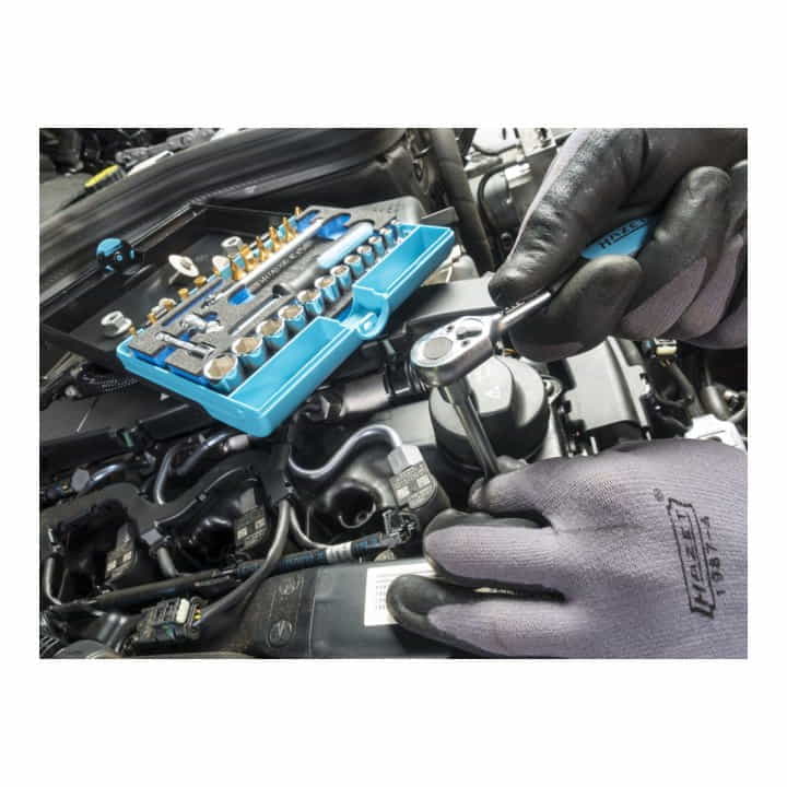 Napęd kwadratowy 6,3 mm (1/4″) - Nasadki wkrętakowe z powłoką CVD-TiN - Wszystkie narzędzia są umieszczone w 2-komponentowej wkładce z miękkiej pianki zapobiegającej wibracjom (system wkładki zabezpieczającej) Zawartość: 1 lever-action reversible ratchet (90 teeth) 1 hexagon socket spanner bit SW 4 / 5 / 5.5 / 6 / 7 / 8 / 9 / 10 / 11 / 12 / 13 / 14 mm each 1 socket spanner bit for screws with hexagon socket profile SW 3 / 4 / 5 / 6 / 8 mm each 1 socket spanner bit for slotted screws 3.5 x 0.6 / 5.5 x 1.0 / 8 x 1.2 mm each 1 socket spanner bit for screws with cross recess (PH) size 1 / 2 each 1 socket spanner bit for screws with cross recess (PH) size 1 / 2 each 1 socket spanner bit for screws with cross recess (PH) size 1 / 2 each 1 socket spanner bit for screws with cross recess (PH) size 1 / 2 each 1 socket spanner bit for screws with cross recess (PH) size 1 / 2 each 1 socket spanner bit for screws with cross recess (PH) size 1 / 2 each 1 / 2 po 1 końcówka nasadowa do śrub z wgłębieniem krzyżowym (PZD) rozmiar 1 / 2 1 uchwyt krzyżowy 1 uchwyt nasadowy kwadratowy po 1 przedłużka 55 / 147 mm 1 przegub uniwersalny