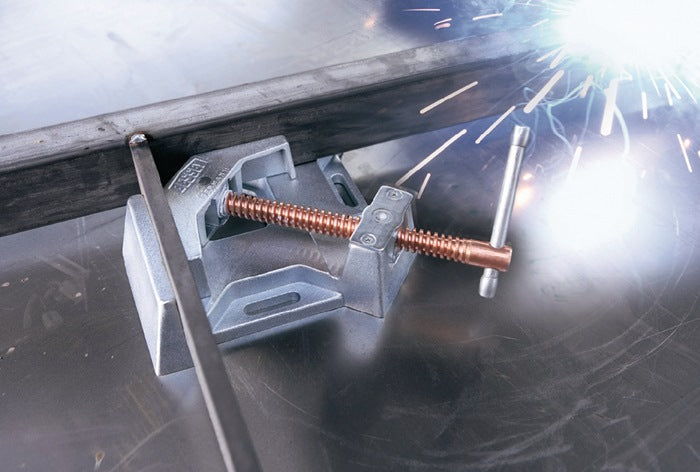 universell verwendbares Spannwerkzeug zum Fixieren rechtwinklig zueinander stehender Bauteile auch unterschiedlicher Dicke · Backen und Grundkörper aus hochwertigem Guß · Spindel verkupfert, deshalb speziell auch für Schweißarbeiten geeignet · durch die seitlichen Langlöcher leicht auf Schweißtischen und Maschinentischen zu befestigen · Winkelbereich: 5° - 180°