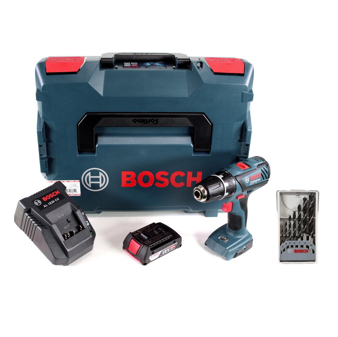 Bosch GSR 18-2-Li Plus Professional Akku Bohrschrauber in L-Boxx mit 1x 2,0 Ah GBA Akku + AL1820CV Ladegerät + Holzbohrer Set