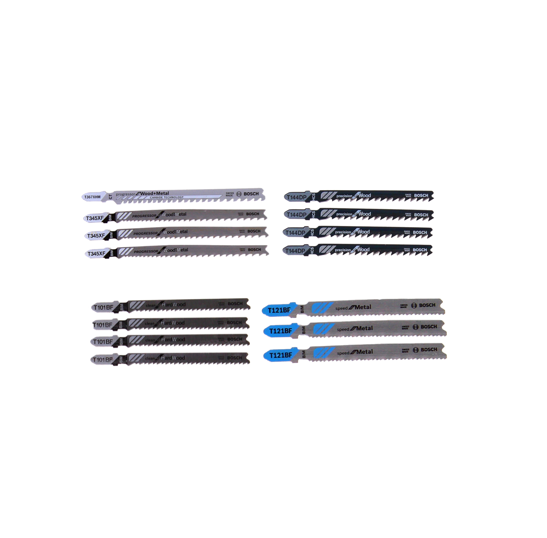 Die Stichsägeblätter von Bosch eignen sich ideal für die Holzbearbeitung und decken alle Anforderungen ab. Das 5-teilige Set ist fest und sicher verstaut und ermöglicht einen einfachen Zugang zur schnellen und praktischen Handhabung bei der Arbeit. Das T101 BF Sägeblatt besitzt eine progressive Zahnteilung (2,7 mm) und ist zum Schneiden einer Vielzahl an Holzmaterialien mit einer Dicke von 3-30 mm ausgelegt. Das T144 DP Sägeblatt besitzt eine erhöhte Stärke und verhindert das Verbiegen und ermöglicht exakte, winkelhaltige Schnitte. Wiederum ist das T121 BF Sägeblatt für saubere und gerade schnitte bestens geeignet.