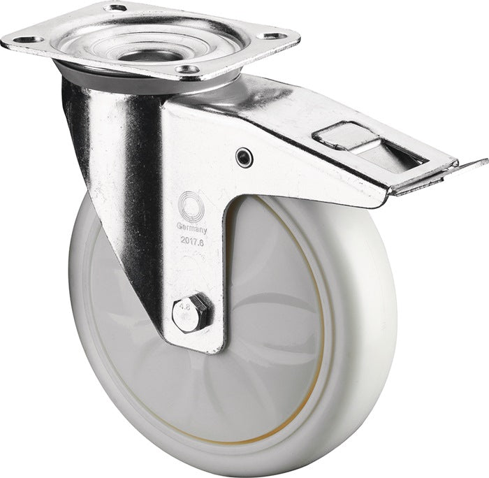 Transportgeräterolle mit Totalfeststeller · Kunststoffrad · schmutz- und spritzwassergeschützt durch den integrierten Fadenschutz · konische Ablenkscheiben verhindern das Ausbremsen der Räder durch Fäden oder ähnliche Fremdstoffe · Kugellager · Gabel aus Stahlblech · zweireihiger Kugelkranz im Gabelkopf · mit Plattenbefestigung