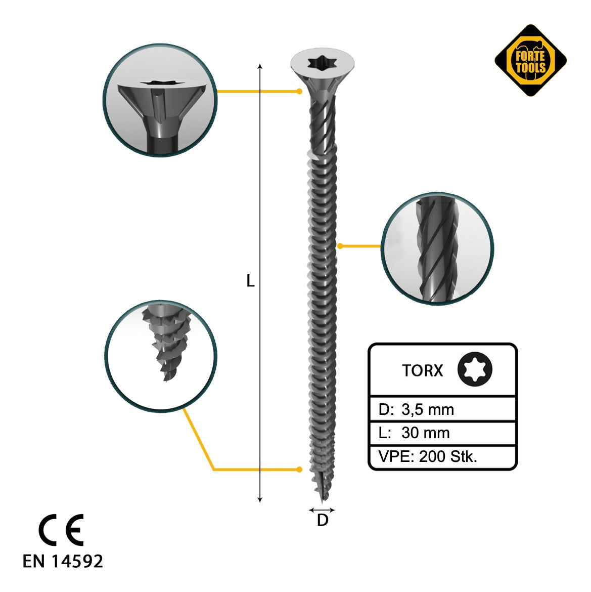 - 200x FORTE Tools Universal Holzschraube 3,5 x 30 mm T15